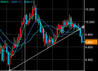 先週は、8月28日と10月2日を結ぶ上昇トレンドラインと100日移動平均線が重なる9.9円付近を下回ると、下落に勢いをつけ、9.69円台までになりました。今後の下落は、9.60円のサポートラインを試す可能性があります。