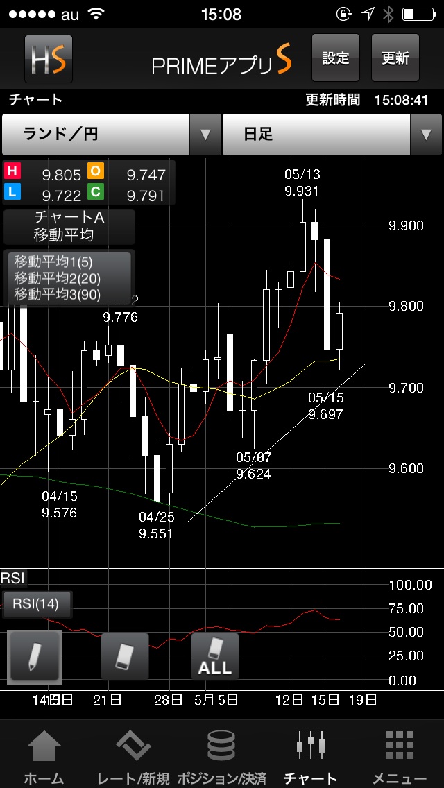 iPhoneのスムーズな操作性をそのままに、ピンチイン/ピンチアウトでチャートを拡大/縮小。 狙った場所にトレンドラインを引けるように、描画時は虫メガネ画面で始点を確認。ローソク足の安値/高値に吸い付くマグネット機能で、思い通りのライン描画と相場分析ができます。