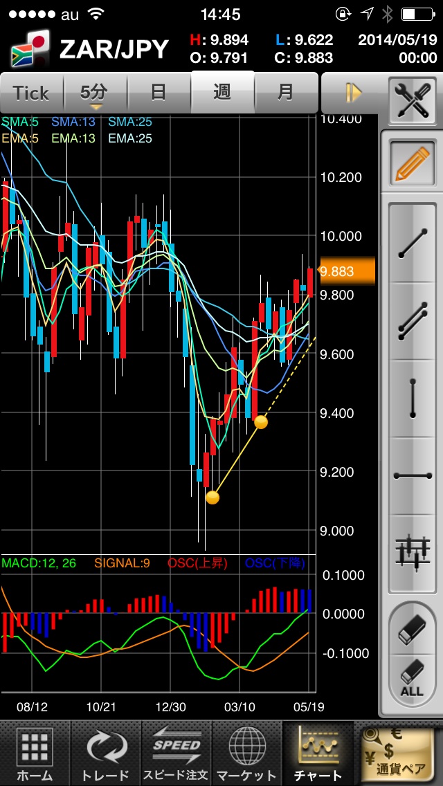 5月21日一時的に南アフリカランド円は、9.6円前半まで円高が進みましたが、反発したので、上昇トレンドは継続しています。10.0円台を試す形になると思います。 毎年GW明けに大きく円安に傾くのですが、21日で反転したので安心しました。 ■週間チャートでは、上昇トレンドを維持しています。
