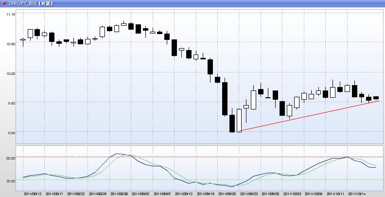 2011年10月19日の南アフリカランドは、9.5円付近をサポートラインとして下げ止まっています。