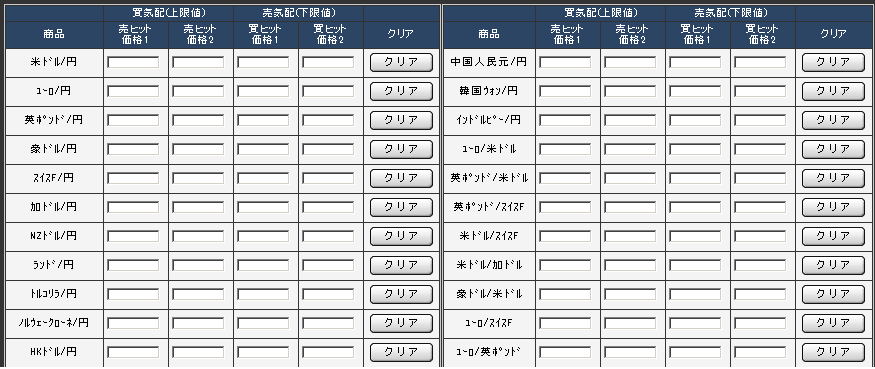 インヴァスト証券【くりっく365】では、各通貨ごとに売りヒットとして2つ、買いヒットとして2つの為替ヒットメール設定が可能です。