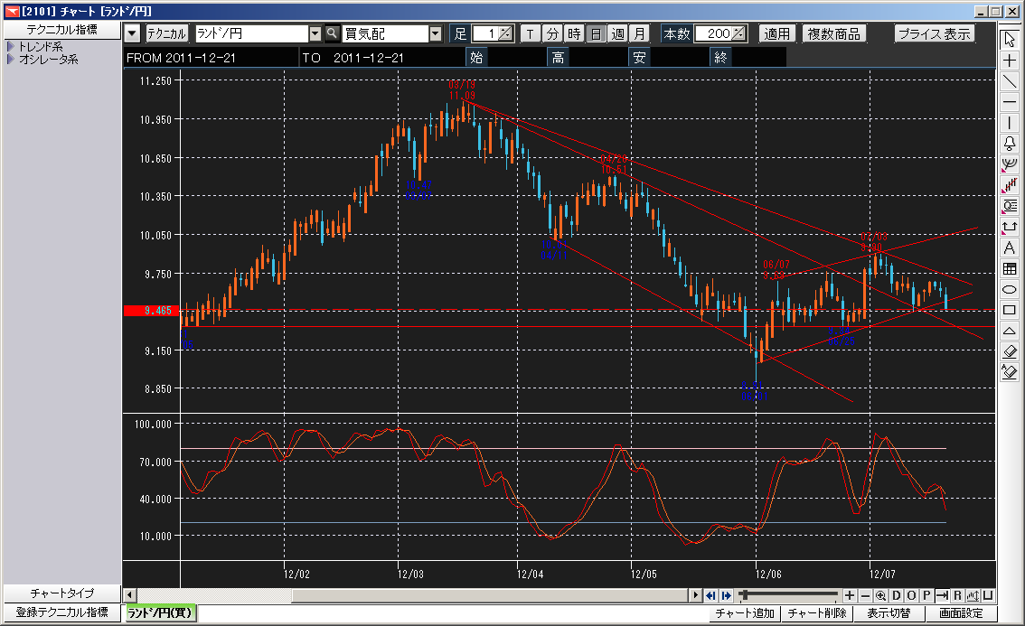 6月4日からの上昇トレンド線を割り込んだので、南アフリカランド9.3円半ばの抵抗線まで下げる可能性がでてきました。