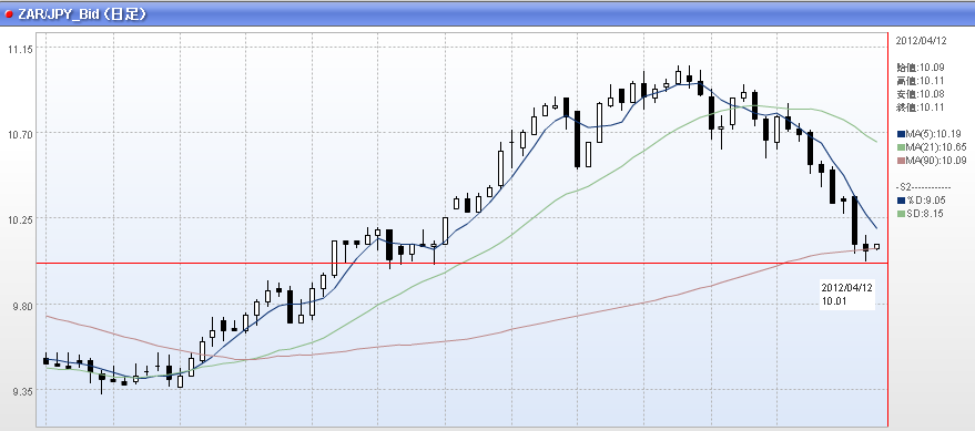 昨日2012年4月10日の南アフリカランド為替は、ヨーロッパの金融不安からドル円が急落し、南アランドも10.10円付近まで急落しました。